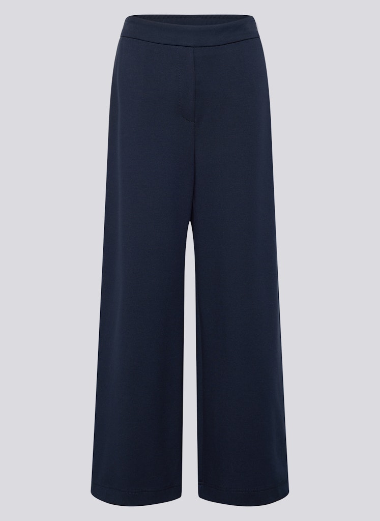 Эти комфортные брюки-слипоны из мягкого джерси привлекают внимание своей модной шириной и эластичным поясом. Благодаря аккуратной отделке без видимых застежек, они выглядят стильно и гладко. Удобные карманы добавляют функциональности. Идеально подходят для повседневных образов в современном стиле.