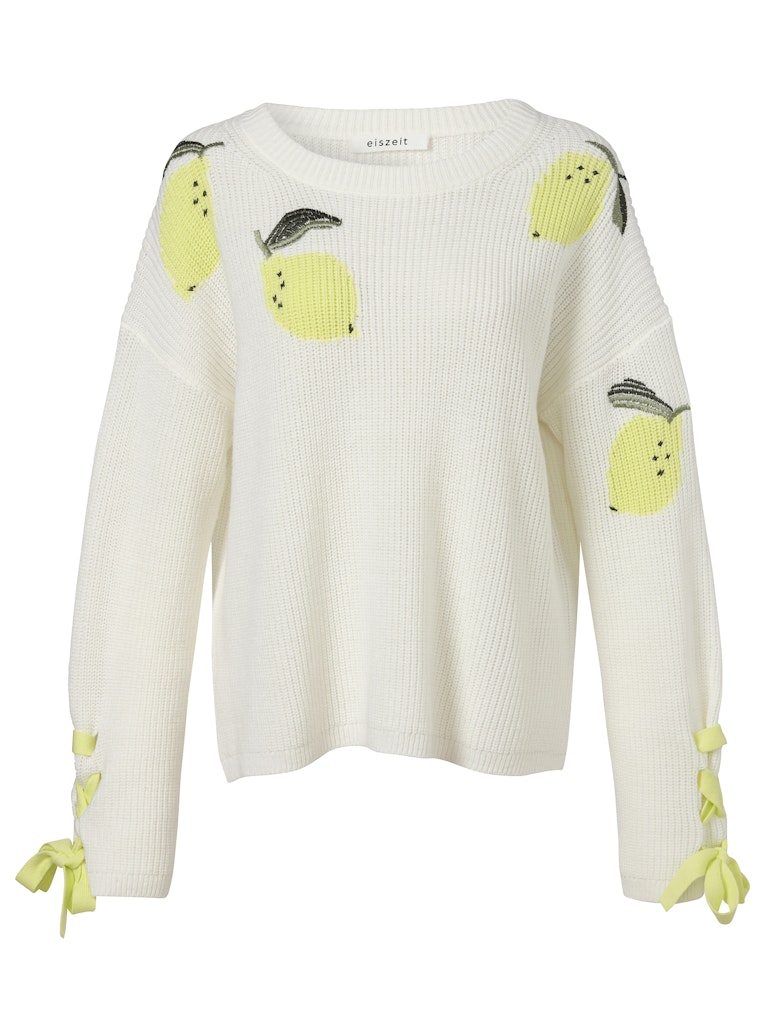 Джемпер от немецкого бренда EisZeit с принтом лимончик и стильными неоново-желтыми завязками на рукавах